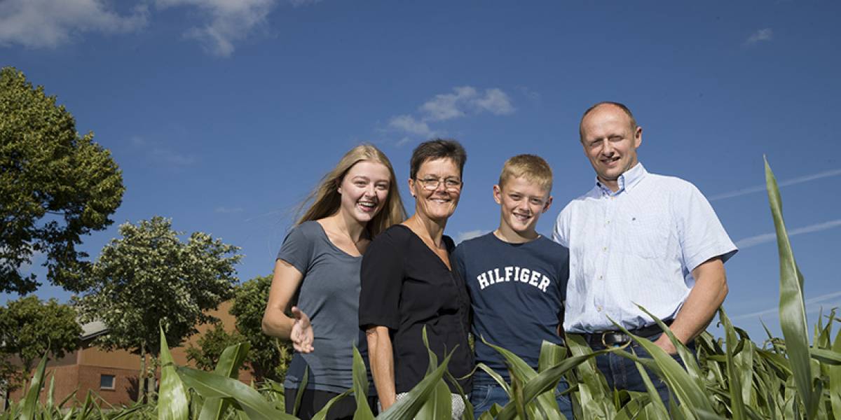 Søren Buhl Knudsen og Anette Henriksen med to af deres børn. De er fjerde generation der driver landbrug på Lundbjerggaard. Foto: aabentlandbrug.dk