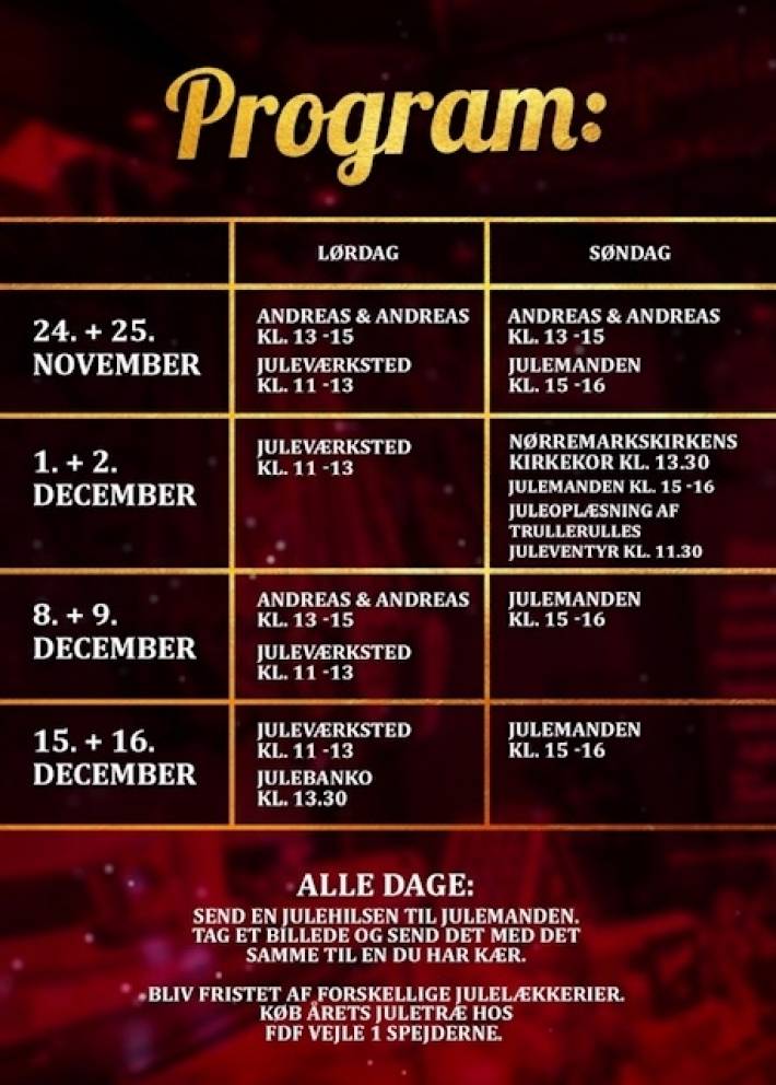 Du kan følge med på Facebook-siden her, hvor der løbende bliver opdateret om, hvad man kan opleve på julemarkedet.