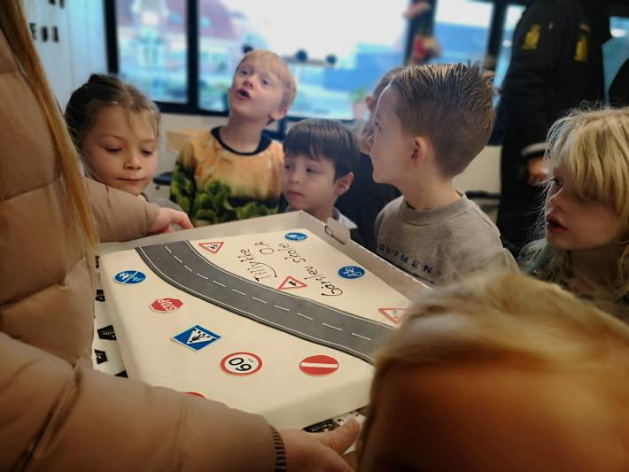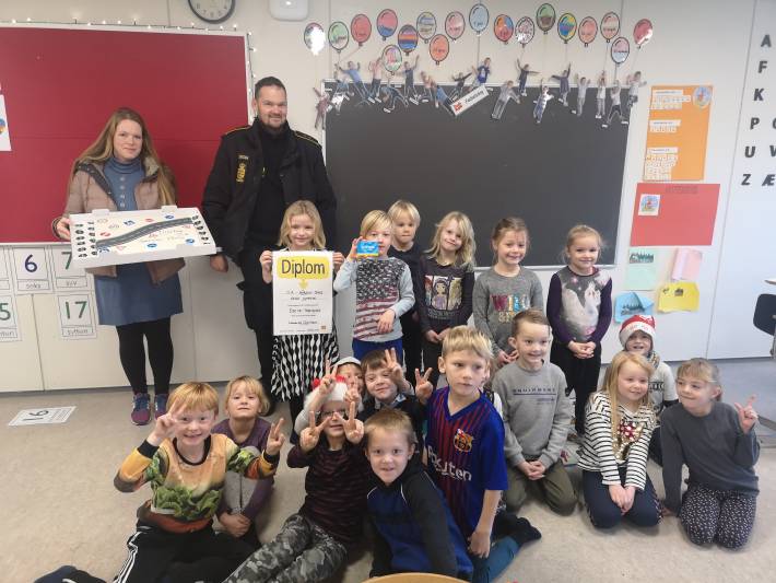 Vejle Kommune har nu trukket lod blandt besvarelserne i Min Trafikbog, og onsdag bankede det på døren til klasseværelset hos de heldige vindere i Gårslev. En lokal betjent fra Sydøstjyllands Politi trådte sammen med kommunens projektleder ind i klassen - og med sig havde de en stor trafik-kage, et diplom og et gavekort på 1000 kroner til City Vejle.