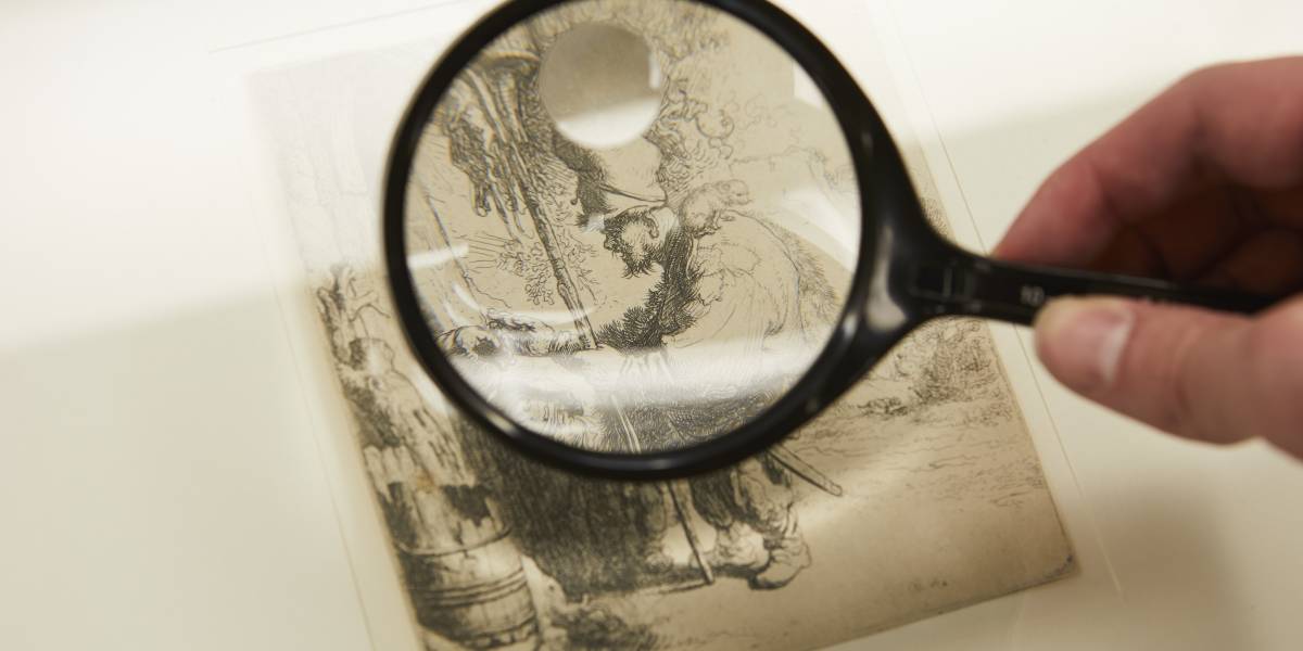 Rembrandt under luppen. Et af de centrale elementer i den kommende udstilling Navigeringer er et historisk miljø, hvor raderinger af Rembrandt (1606-1669) udstilles sammen med originale håndkolorerede søkort fra samme periode. Hvor søkortene oplyser den omgivende verden ved at opmåle og kortlægge den, åbner Rembrandts kunst for et indre mørke af uopmålelige dimensioner. Foto: Vejle Kunstmuseum