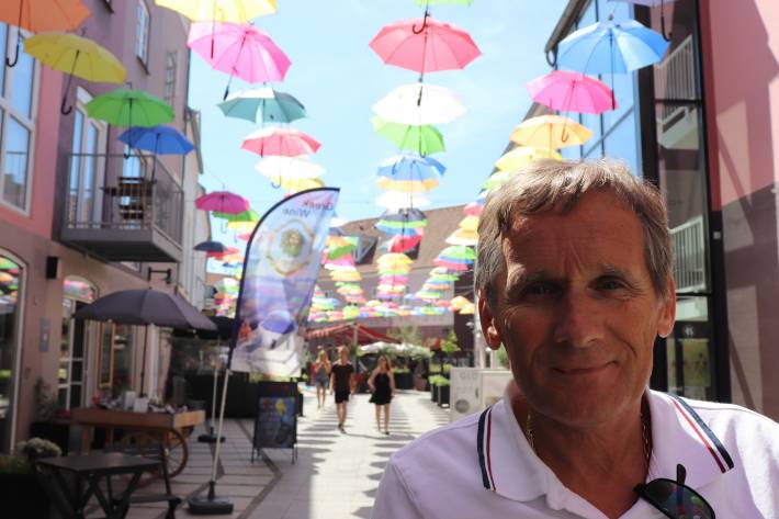 Jeg sætter stor pris på Vejle Midtpunkt. Husene er anderledes her, og der er et godt naboskab - man hilser på hinanden. Og så er det smukt, at der løber en å igennem - og paraplyerne er fantastiske! Dén, der kom på det, fik virkelig en god idé. Især om sommeren er her dejligt. Når der er koncerter, nyder jeg at sætte mig med et glas vin og lytte til musikken.
