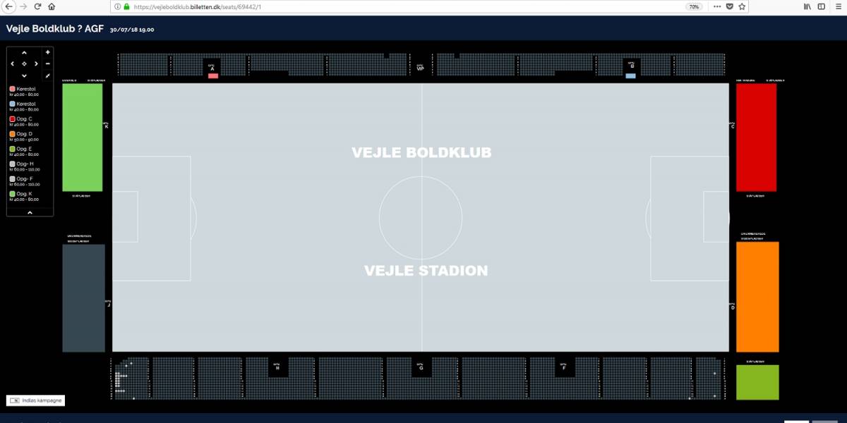 De enkelte ledige pladser i nederste venstre og højre hjørne, viser de ledige pladser på langsiden. Screenshot fra billetten.dk.